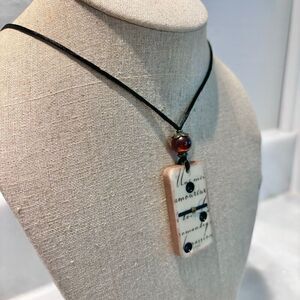 This Vintage RK Productions necklace from the Hand Cast Stone Collection features a unique design with a stone pendant and a hand-carved domino stone drop, crafted in Canada. The necklace is strung on a black cord with a knotted slide closure for adjustable wear. The combination of natural stone elements and the carved domino pendant adds an artisanal touch, making it a standout piece for any collection.