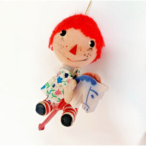 Vintage Raggedy Ann & Andy Riding Hobby Horses Christmas Ornaments Felt Hong Kong.