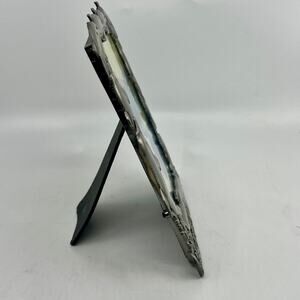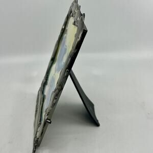 The vintage Raj 2000 picture frame features a metal pewter design showcasing ocean life, specifically dolphins and whales. The frame is of high quality, being made of pewter with a metallic finish, adding a touch of elegance to any decor. The intricate design captures the essence of marine life, making it a unique and eye-catching piece for displaying cherished photos.