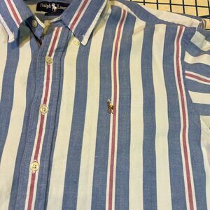 This vintage Ralph Lauren Oxford shirt for men in size L features a classic blue and red striped pattern with a button-down collar and long sleeves.