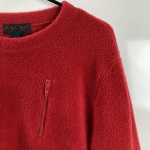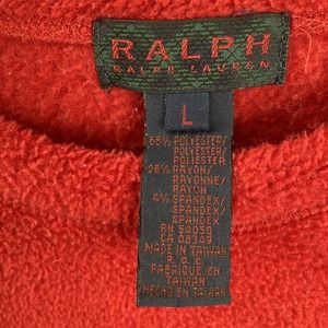 This listing is for a Vintage 90s Ralph Ralph Lauren Women's Pullover Fleece. Red. Zip pocket at the chest. Boxy Fit. Logo at the side of the bottom hem. Polyester/Rayon/Spandex. Made in Taiwan.