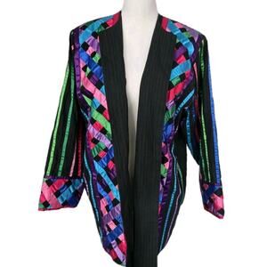 Vtg Rare 80s Tachi Castillo Boho Ribbon Colorful Mexico Open Blazer Jacket Sz L