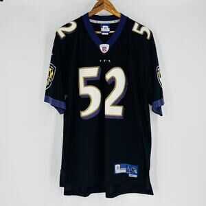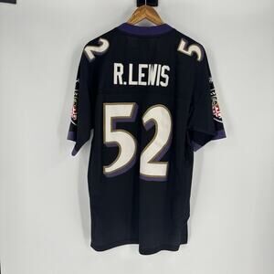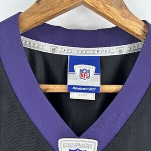 The product is a vintage Ray Lewis Baltimore Ravens jersey in size Large, officially licensed by the National Football League (NFL). Made by Reebok, this black jersey features the iconic player's name sewn and stitched, perfect for male fans of the Baltimore Ravens. Represent your favorite team and player with this authentic sports memorabilia, ideal for any football enthusiast looking to add a piece of their favorite team to their collection.