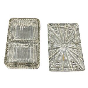This vintage clear glass dish is an elegant and functional piece for any table setting. Its rectangular shape and divided compartments make it ideal for serving various appetizers, condiments, or small treats. The intricate design on the lid adds a touch of sophistication, suitable for both casual and formal gatherings.
