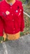 Keywords: knit sweater, embroidered cardigan, pompom sweater, flower embellishment, cozy knitwear, handcrafted sweater, unique cardigan, red knitwear, women's fashion, artisanal clothing, statement cardigan,