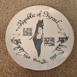 Vtg Republic Of Israel Commemorative Plate 23k Gold Band Made in USA 1948 10"