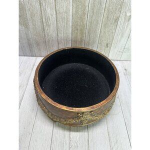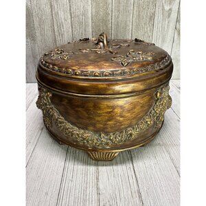 Vintage resin trinket jewelry box with intricate floral design, perfect for storing small treasures. Measures 8.5 inches round and 5.5 inches tall with a lid for added elegance.