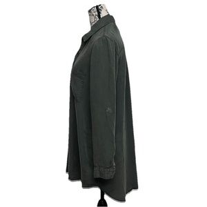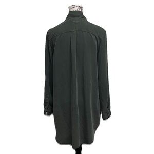 This vintage retro AMI green Lyocell mini dress is perfect for those who love the army outdoor gorpcore utility style. With a collared neckline, button closure, and roll tab sleeves, this dress is ideal for travel or casual occasions. The solid green color and knit fabric give it a rugged, grunge-like look, while the short length and vintage brand add a unique touch. Pair it with your favorite accessories to create a stylish and edgy ensemble for the summer, fall, or spring seasons.