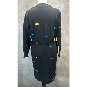 Vtg Retro Black Knit Sweater Dress Vibrant Geometric Pattern Pockets Women's Med