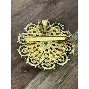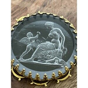 This vintage pendant brooch features a unique reverse carved intaglio design of a nude woman and angel, set in a round gold-colored glass pendant. The intricate details and Victorian theme make it a stunning piece of jewelry that showcases the artistry and craftsmanship of the era. The combination of glass and metal materials adds a touch of elegance and sophistication to any outfit, making it a versatile accessory for both formal and casual occasions.