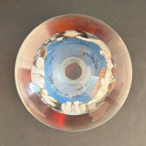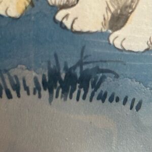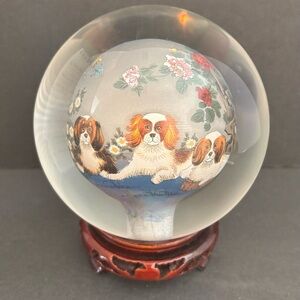 Reverse Hand-painted DOG Flowers Paperweight Glass Orb. With wooden stand. Vintage. About 4” tall. And about 4” wide. Very thick but hollow. Normal shelf wear but no chips or cracks. I believe the dogs are Cavalier King Charles Spaniels. Adorable dogs, flowers and butterflies, a perfect addition or gift to the dog lover in your life. The last picture shown is with a standard light used with Christmas village houses to show how beautiful it is with light. Best to get a light stand for that (not included, just a suggestion). Also appears to be signed in the “grass” part but hard to make out.