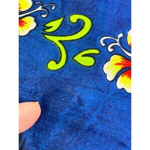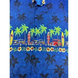 This vintage Hawaiian shirt features a vibrant surfboard and palm tree print. Ideal for casual wear or themed events.