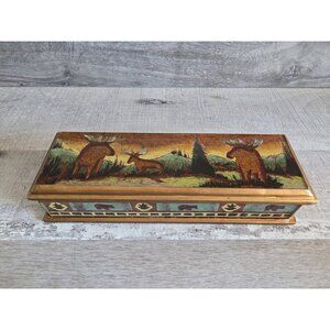 Vtg Robert M. Weiss Glass On Wood Trinket Box Cabin Decor Moose Bears Peru G30.5
