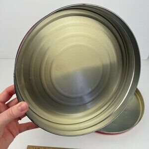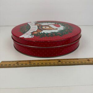 Vtg Round Metal Tin Teddy Bear Happy Holidays Red w Polka Dots 10in Diameter