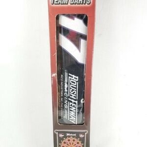 The product is a vintage Roush Fenway Racing #17 NASCAR Magnetic Darts Game, perfect for a mancave or sports-themed room. This game features magnetic darts with the team logo and colors, adding a fun and unique touch to indoor games. The wall-mounted design allows for easy play and display, making it a great addition for NASCAR fans looking to add a bit of racing excitement to their space.