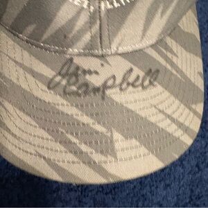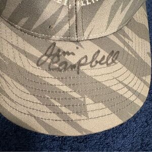 The product is a vintage Route 66 Raceway Joliet trucker hat cap signed by Jim Campbell. This Snap-Back hat is designed for men and features a camo color with a mesh back for breathability. The adjustable snapback closure ensures a comfortable fit, making it a stylish and functional accessory for any racing enthusiast.