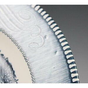 In vintage condition with some utensil marks from use. Also a few manufacturing flaws such as stray paint marks and dimples under the glaze. May also be slight variations in the width of the blue and white border and the color intensity. See photos for examples.