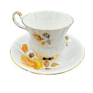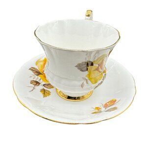 This elegant bone china tea cup and saucer set, adorned with a yellow rose pattern and gold accents, offers timeless sophistication for collectors or tea enthusiasts.