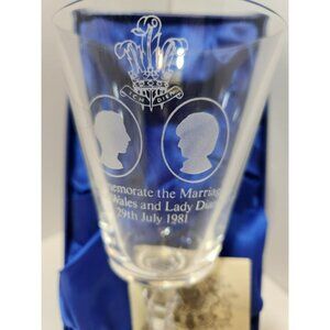 This product is a vintage glass crystal etched chalice made in the United Kingdom to commemorate the royal wedding of Prince Charles and Princess Diana in 1981. It is a historical memorabilia piece that celebrates British royalty and their history. The chalice is a unique collectible item that would appeal to those interested in royalty collectibles and royal memorabilia. Its vintage nature adds to its charm and historical significance, making it a special piece for collectors or enthusiasts of British royalty. New old stock from vendor. Box shows shelf wear. Please see pictures for details.