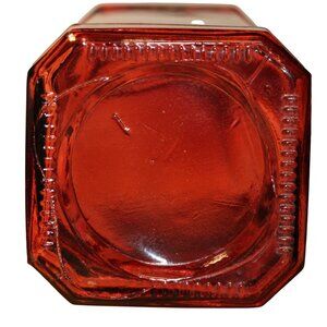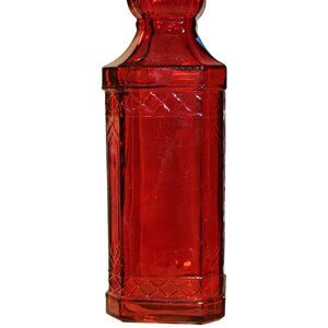 A striking ruby red glass decanter with a cork stopper, featuring intricate raised designs. This decorative piece stands 12 inches tall, ideal for display or functional use.