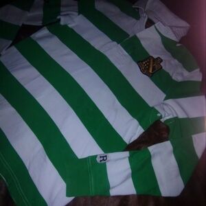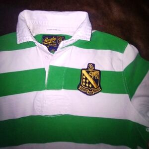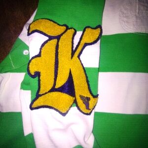 Green and White distressed and faded style Rugby Polo with 10 patch on the back front patch and Letterman K the patch from the sleeve.