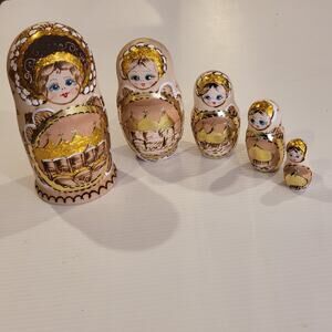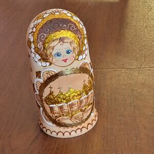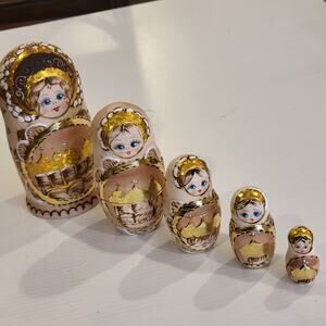 Vtg Russian Burned Wood Hand Painted Matryoshka Nesting Dolls Set of 5 Orthodox. The biggest one is 7.25" tall. Weight 9oz plus shipping materials.