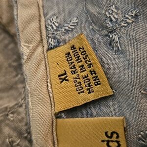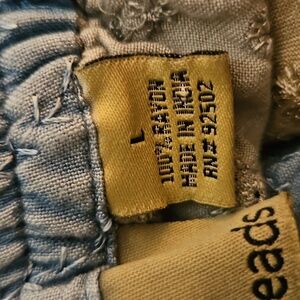 Top is button down and have a ruffled hem. Pants have an elastic waist, pockets and roll tab legs. There is one stain on the front of top, see photo. Not noticeable when worn.