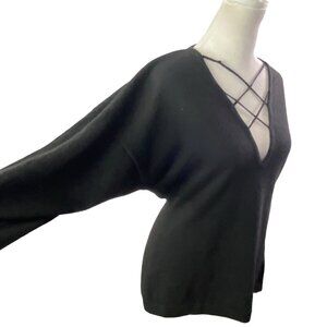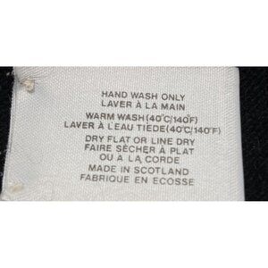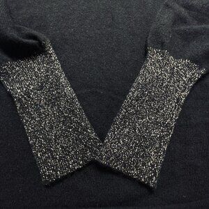 This vintage SCOTCH HOUSE women's pullover cashmere sweater in size M features a classic black color with a solid pattern and tight-knit design. The sweater has long sleeves and a V-neckline with criss-cross straps, making it suitable for various occasions such as parties, casual wear, or business events. Made from 100% cashmere, this lightweight sweater is perfect for the winter, fall, and spring seasons. The elegant gold threads on the sleeves add a touch of sophistication to this timeless piece.