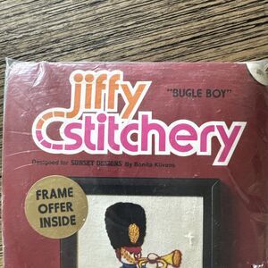 This vintage, sealed Jiffy Stitchery Embroidery Kit features a charming Bugle Boy design, perfect for holiday or Christmas decor. The kit includes everything needed for a beautiful wall hanging, and is made by Sunset Designs.