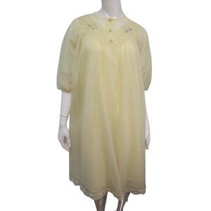 Vintage SHADOWLINE Nylon Night Gown Peignoi Size S Yellow Sheer Lace Buttons EUC
