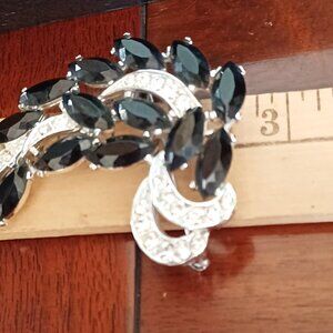 Black navette shaped rhinestones and smaller white/clear round ones in silver tone setting