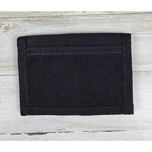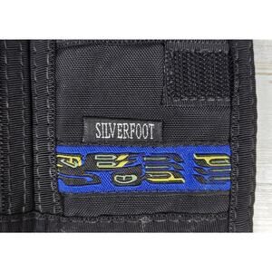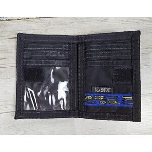 Rugged SILVERFOOT bifold wallet made in Canada. Crafted from heavy-duty black nylon with a woven "Blue Raven" trim. Features multiple card slots, clear ID window, hook and loop closure and reinforced edges. Good pre-owned condition with minor wear. There are some scuffs on the clear window. Please see pics. This particular design is discontinued and vintage.