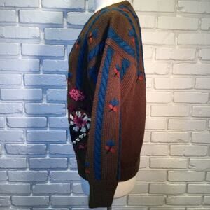 Excellent vintage sweater in like new condition. Made in The British Crown Colony of Hong Kong. Has a hand knit look to the sweater. Lovely tones of brown and blue. Tagged size medium, shown on a small mannequin. 1 lb 11oz wool C