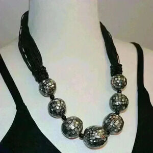 Vtg Sajen Large Statement Graduated Sphere Disco Necklace Black Mosaic Abalone