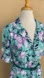 Purple, green, white and navy floral print. Collared with button front, full skirt and no belt. Rayon. Pockets.