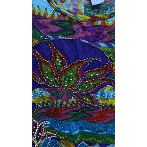 Add a pop of happy color to your wardrobe with this vintage Sandy Starkman beaded and studded multicolor t-shirt. Made from 100% cotton and crafted in India, it features an abstract, color-block floral print bursting with rainbow vibes, perfect for festival fun, coastal cool, or art-to-wear style.
