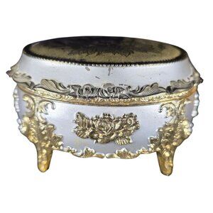 This ornate footed oval music box features a delicate floral and hummingbird design on the lid. The gold and silver finish enhances its vintage charm.