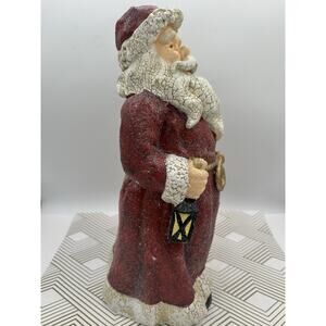 This antique Santa Claus resin lantern features a large 14" size with a crackle finish and heavy glittering, making it a detailed and eye-catching piece for Christmas.