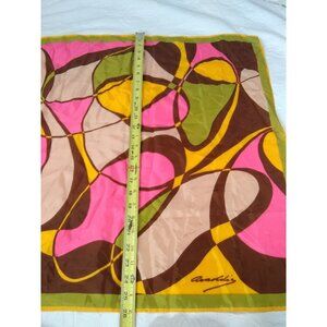 Vtg. Scarf Retro Optic Psychedelic Japan 25.5" X 26" (Almost). By Arnoldis( cannot read signature well). Pre owned good vintage condition with some noted wear marks in a couple of spots with unknown material due to wear on tag on the back. For more details please study all pictures.