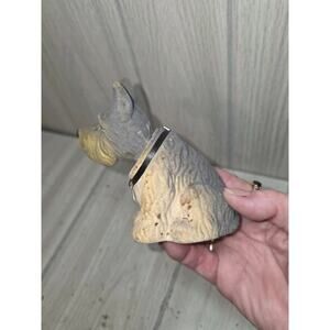This vintage Schnauzer nodder bobble head figurine is a charming collectible featuring a Scotty dog design. Made of stone in the United States, this figurine captures the playful and loyal nature of schnauzers with its nodding motion. It is a unique and eye-catching piece for any dog lover's collection.