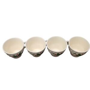 Add a touch of vintage charm to your kitchen with this delightful set of 4 Scio Pottery Holly Berry tea or coffee cups. These white, swirled ceramic cups feature a festive holly berry design, perfect for the holidays or any time of year. Each cup is in great vintage condition and ready to bring warmth and joy to your beverage experience.