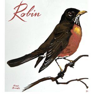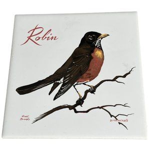 This beautiful vintage ceramic tile features a detailed illustration of a red-breasted robin perched on a branch, signed by artist R. Brooks and printed by Screencraft. The artwork is vivid and crisp, capturing the charm of this classic songbird.