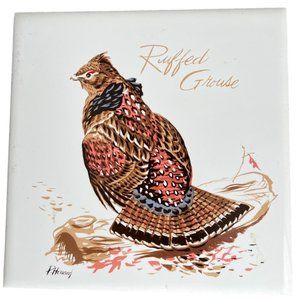 This vintage ceramic tile features a beautifully illustrated ruffed grouse, printed by Screencraft and signed by wildlife artist Phyllis Howard. The rich detail and warm color palette make it a standout piece for rustic or nature-inspired spaces.