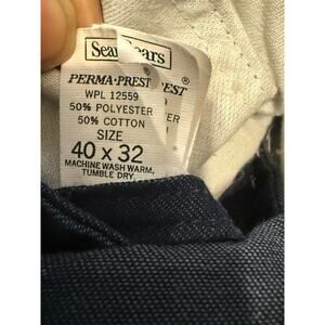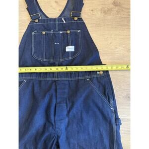 This product is a pair of vintage Sears Tradewear men's bib overalls in size 40 x 32. Made in the USA with denim fabric, these overalls feature metal buttons, adjustable shoulder straps, a hammer loop, and pockets for added functionality. The classic blue color and straight leg style make them suitable for various occasions including workwear and casual outings. With a durable cotton material and a zip closure, these overalls offer both style and practicality for the modern man. The overalls are in good pre-owned condition. Please see all of the photos for more details.