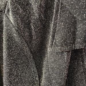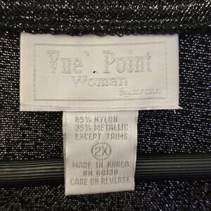 The product is a vintage-inspired semi-sheer black silver metallic button-up shirt in size 2X, perfect for those looking for a dark and edgy 90s vibe. This Y2K witch-inspired top features a V-neckline, long sleeves, and a solid black color with metallic accents. Ideal for various occasions including casual, formal, and workwear, this blouse is made of nylon and metallic fabric, offering a regular fit and suitable for all seasons. With a gothic, rock, and retro theme, this blouse by Vue Point is sure to make a statement, whether worn for a party or a more traditional event.