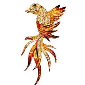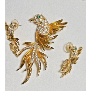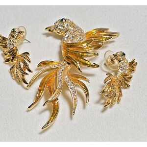 Beautiful 3 piece set.. Brooch & Earrings set. Large 3" Green eyed Bird of Paradise Enameled Chrystal Rhinestone Goldstone Brooch with matching pierced earrings. Good vintage condition, no damage or missing stones detected..Stunning 3 piece set...great gift.