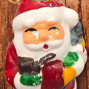Santa ornament shows minor paint chipping on face and glove.