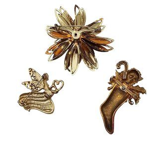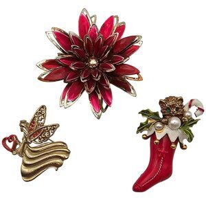 Vtg Set of 3 Brooch Lot Christmas Holiday Stocking Cat Signed Angel Flower Red