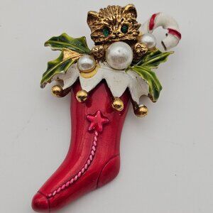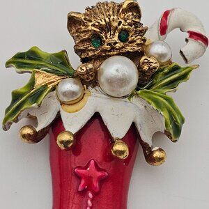 • Stocking with cat Signed ART, green jeweled eyes, faux pearls, enamel has some wear, 2.25" long, .58g (holly, candy cane)