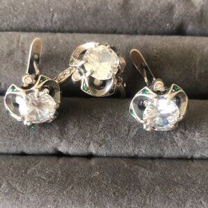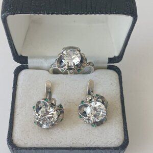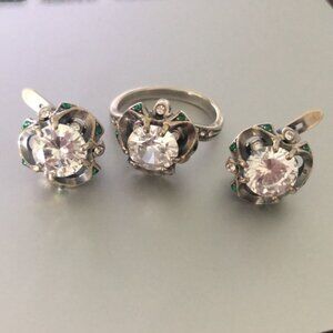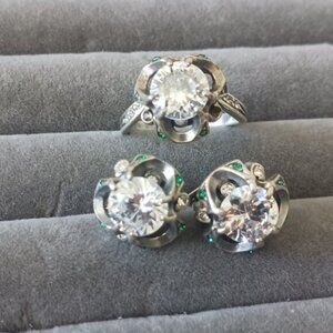 Vtg Set of 925 Sterling Silver Earrings W CZ Clear and Green Stones and Ring